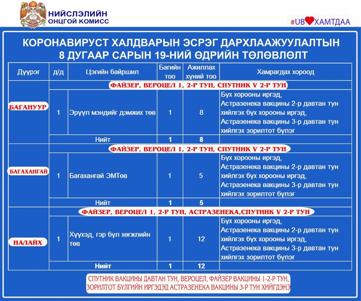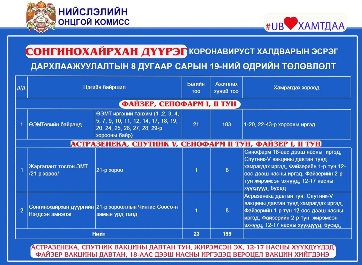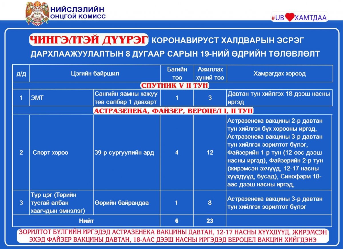 Нийслэлийн хэмжээнд Covid-19 халдварын эсрэг вакцины эхний тунд 600, хоёр дахь тунд 2079, гурав дахь тунд 266, нийт 2945 иргэнийг дархлаажуулалтад хамруулсан байна. Үүнээс 20 жирэмсэн эх, 12-17 насны 771 хүүхдэд дархлаажуулалтын эхний тунг, 43 жирэмсэн эх, 2076 хүүхдэд давтан тун хийлгэжээ.