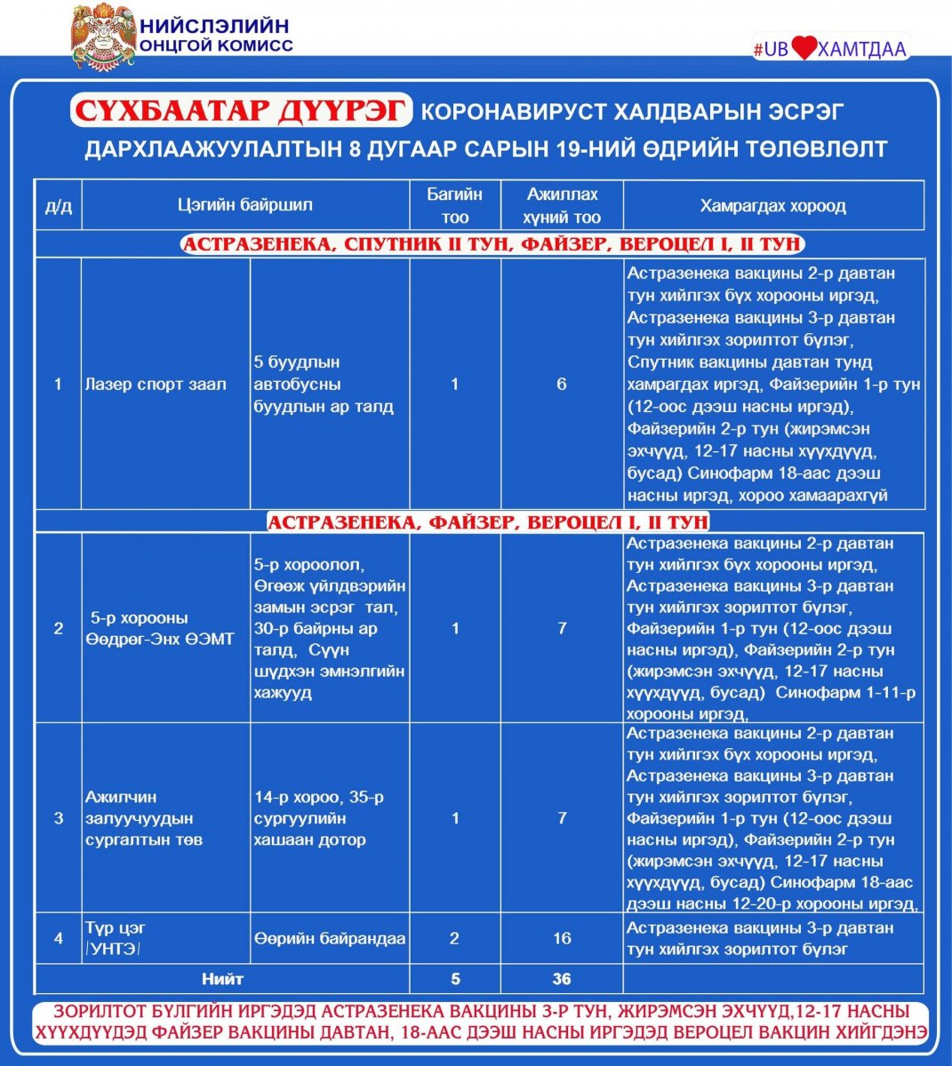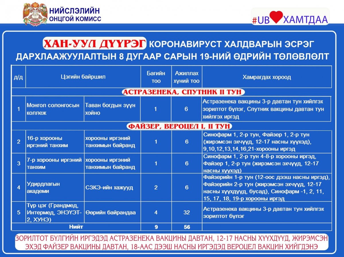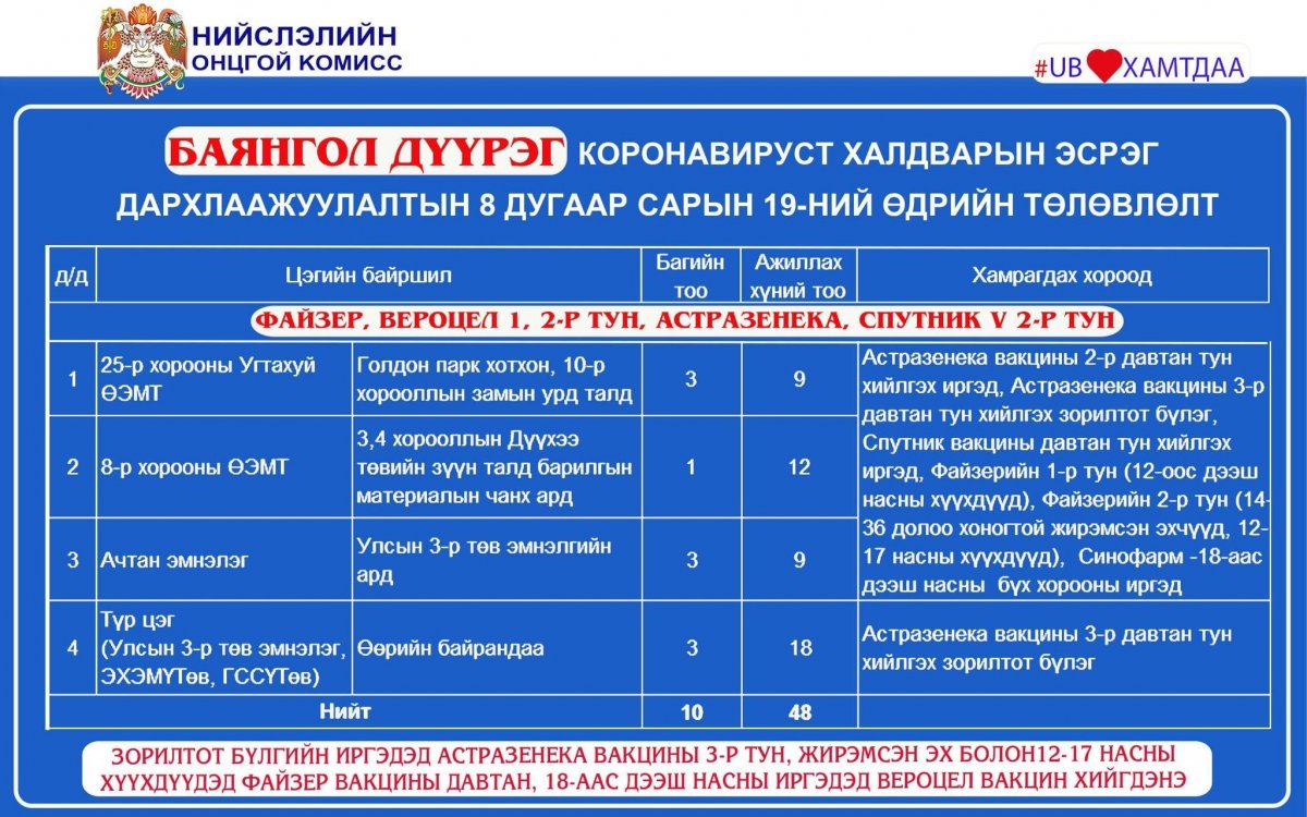 Нийслэлийн хэмжээнд Covid-19 халдварын эсрэг вакцины эхний тунд 600, хоёр дахь тунд 2079, гурав дахь тунд 266, нийт 2945 иргэнийг дархлаажуулалтад хамруулсан байна. Үүнээс 20 жирэмсэн эх, 12-17 насны 771 хүүхдэд дархлаажуулалтын эхний тунг, 43 жирэмсэн эх, 2076 хүүхдэд давтан тун хийлгэжээ.