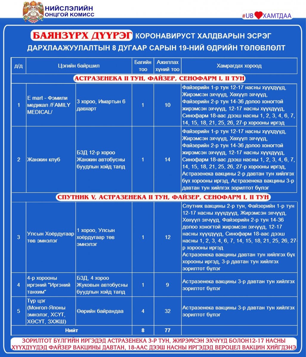 Вакцинжуулалт эхэлснээс хойш нийслэлийн зорилтот бүлгийн буюу 3907 (32.8 хувь) жирэмсэн эх, 12-15 насны 71.520 (80.5 хувь), 16-17 насны 28.384 (83.8 хувь) хүүхэд тус тус дархлаажуулалтад хамрагдсан байна.