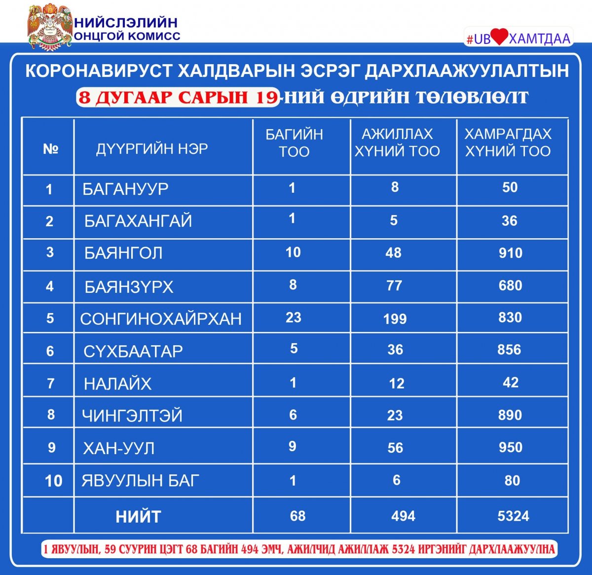 Улаанбаатар хотод явуулын нэг, суурин 59 цэгт 68 багийн 494 эмч, ажилтан ажиллаж, 5324 иргэнийг дархлаажуулахаар төлөвлөжээ.